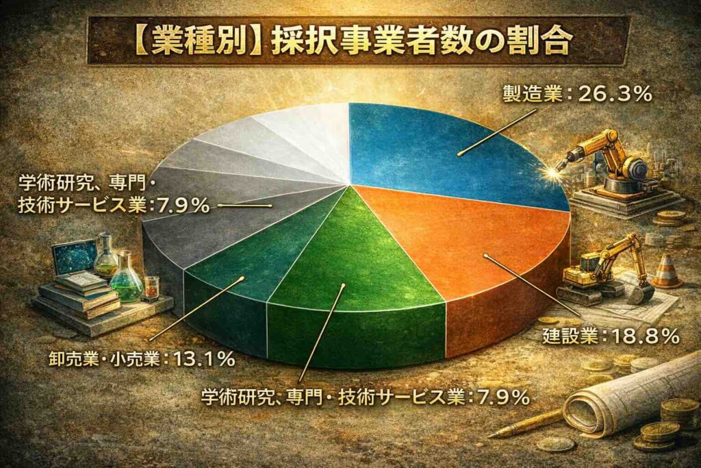 採択数832者のうち、製造業と建設業で全体の約45%を占めており、この2業種に採択が集中していることが分かります。