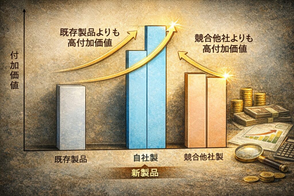 ・新製品等のジャンル・分野における一般的な付加価値や相場価格と比較して、自社が製造等する新製品等が、高水準の高付加価値化を図るものであるかを審査します。